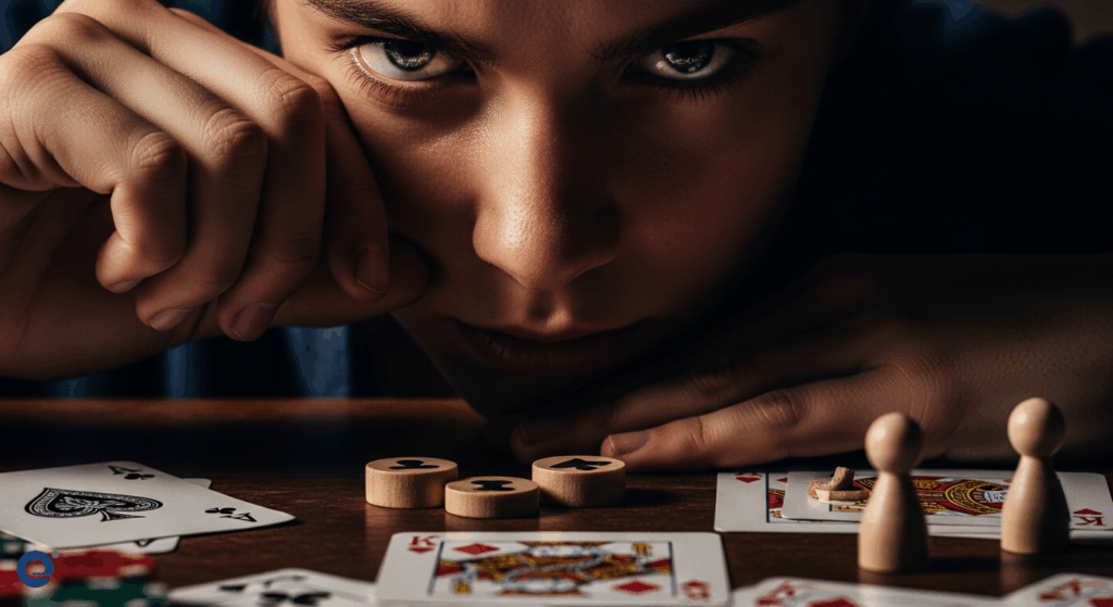 Một người chơi Ma Sói với vẻ mặt bí ẩn, ánh mắt sắc sảo, đang âm thầm tính toán bước đi tiếp theo trên bàn cờ, chuẩn bị cho màn phục hận đầy kịch tính.