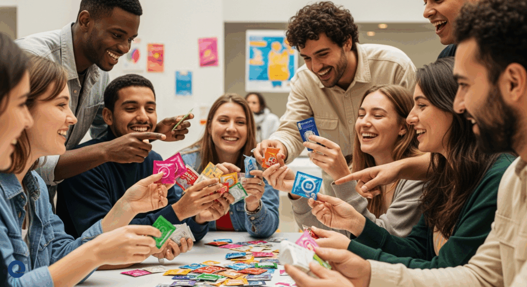 Một nhóm bạn trẻ đang trao đổi và chia sẻ các loại bao cao su khác nhau với biểu cảm vui vẻ, thể hiện tinh thần cộng đồng và sự chủ động trong việc bảo vệ sức khỏe.