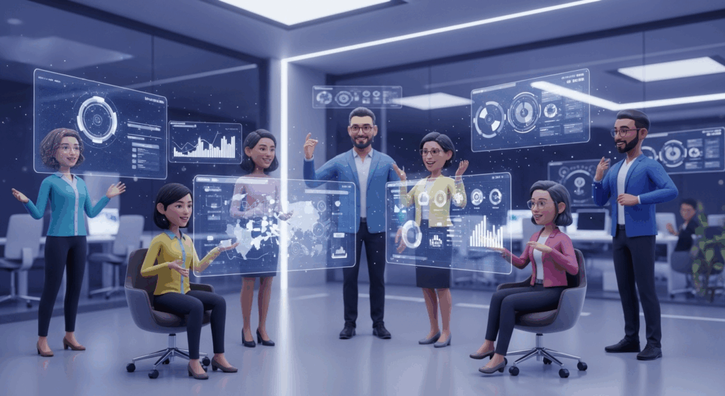 Một nhóm nhân viên đa quốc gia, mỗi người đại diện bởi một avatar sống động, đang cùng nhau thảo luận sôi nổi trong một không gian văn phòng ảo được thiết kế hiện đại, với các màn hình 3D hiển thị dữ liệu dự án lơ lửng xung quanh họ.