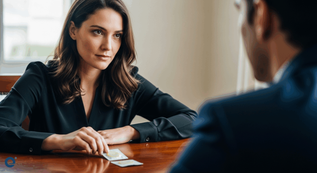 Một người phụ nữ khéo léo đặt một chiếc bao cao su lên bàn, ánh mắt kiên định nhìn về phía đối diện, thể hiện sự từ chối lịch sự nhưng dứt khoát.