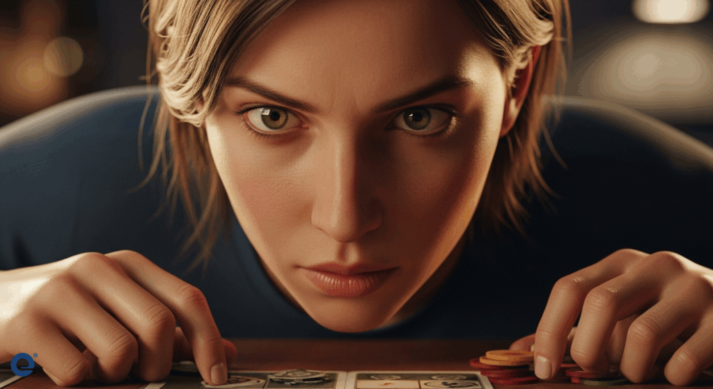 Một người chơi Ma Sói tập trung cao độ, đôi mắt quét qua từng nét mặt đồng đội, tìm kiếm những “tín hiệu mỏng” để phán đoán kẻ lừa dối.