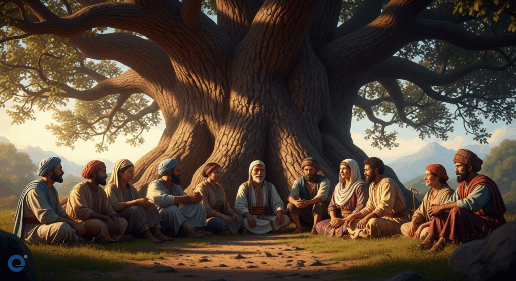Một nhóm người đa dạng, thuộc nhiều nền văn hóa và tôn giáo khác nhau, đang cùng nhau ngồi dưới một cây cổ thụ lớn, chia sẻ câu chuyện và cười đùa vui vẻ, thể hiện sự hòa hợp và thấu hiểu.