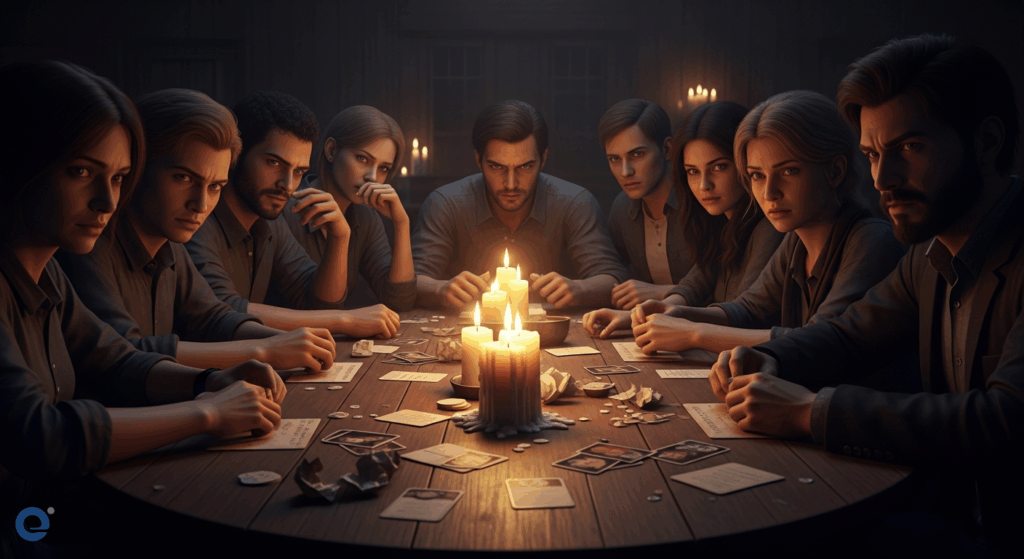 Những người chơi Ma Sói căng thẳng nhìn nhau, ẩn chứa những bí mật và toan tính.