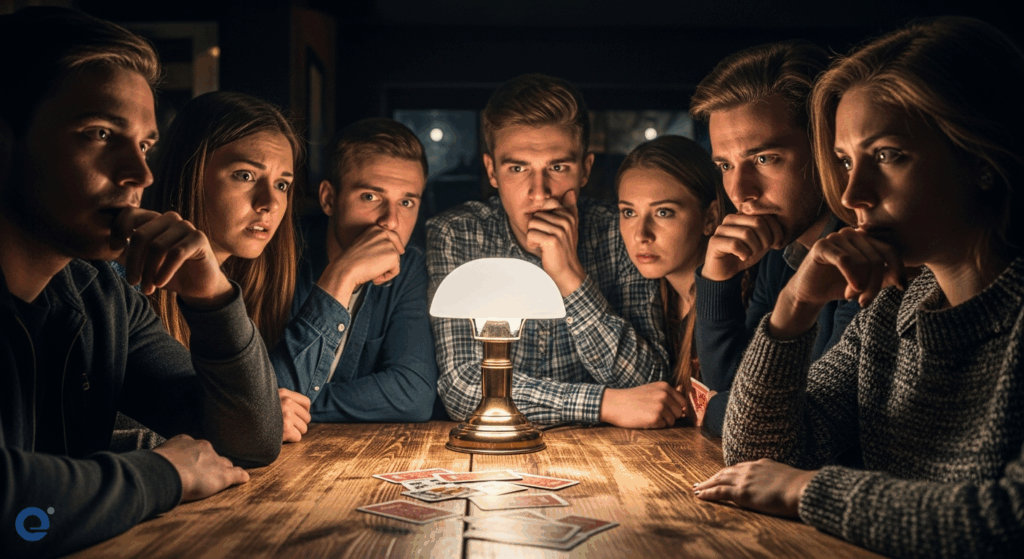 Một nhóm người trẻ tuổi đang ngồi quanh bàn, nét mặt căng thẳng, ánh mắt dõi theo từng cử động của đối phương trong không khí đầy kịch tính của ván Ma Sói.
