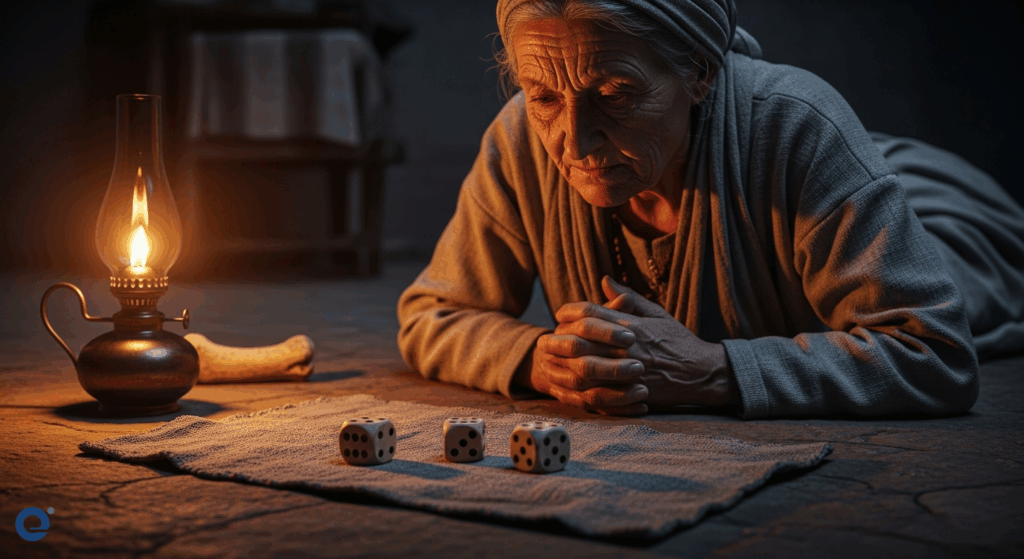 Một người phụ nữ cổ đại, mặc áo choàng đơn giản, đang nhìn chăm chú vào ba viên xúc xắc bằng xương trên một tấm vải trải trên mặt đất. Ánh sáng mờ ảo từ ngọn đèn dầu chiếu lên khuôn mặt bà, tạo ra những bóng đổ kỳ bí, gợi lên sự chờ đợi và suy tư về vận mệnh.